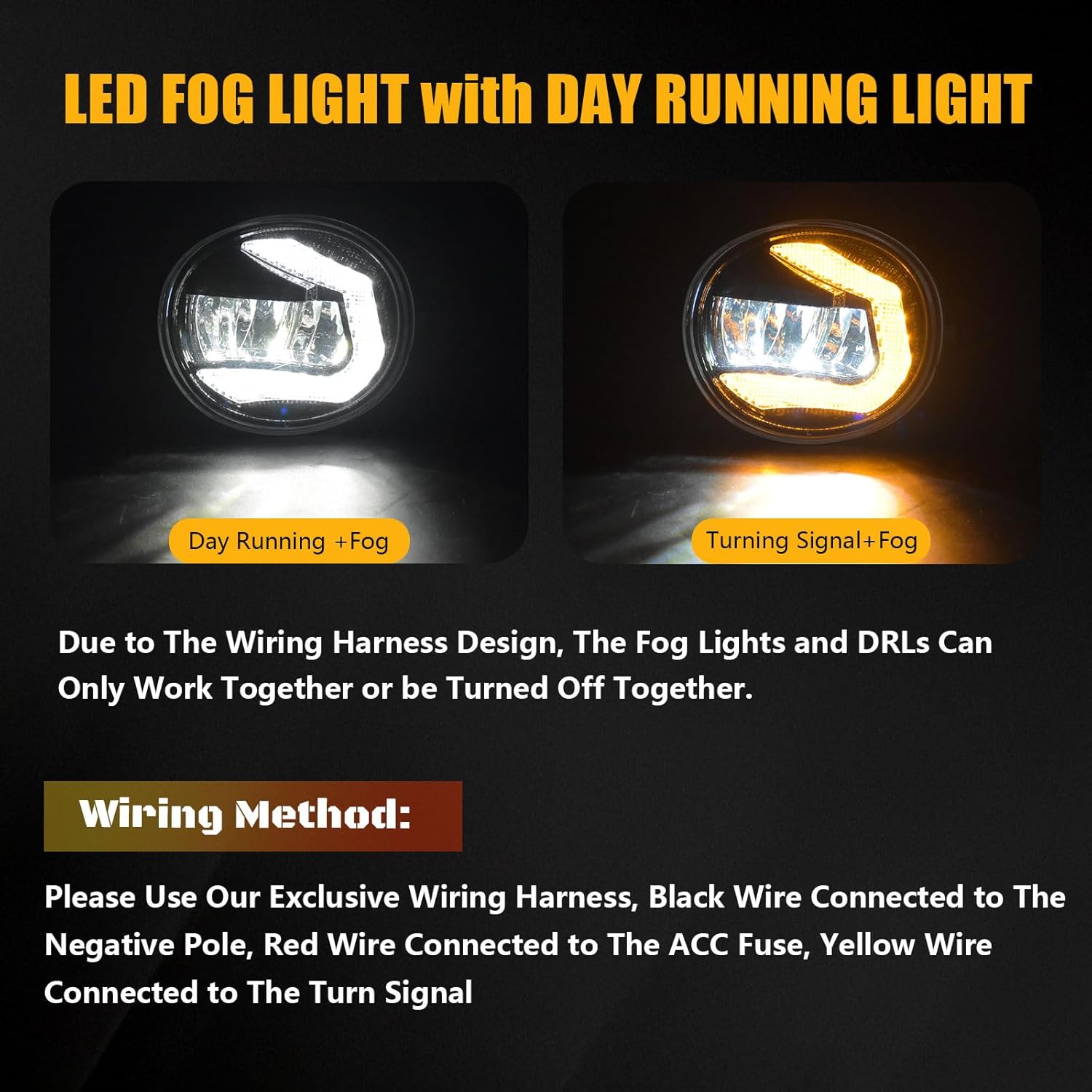 - About installation: The Fog Lamp with DRL Has a Dedicated Wiring Harness. You Need to Use Our Wiring Harness to Connect. The Red Wire Connects to The ACC Fuse,Black Wire Connects to the Negative Pole of The Battery,Yellow Wire Connects to the Turn Signal.If You Have Any Questions, Please Consult the Online Customer Service