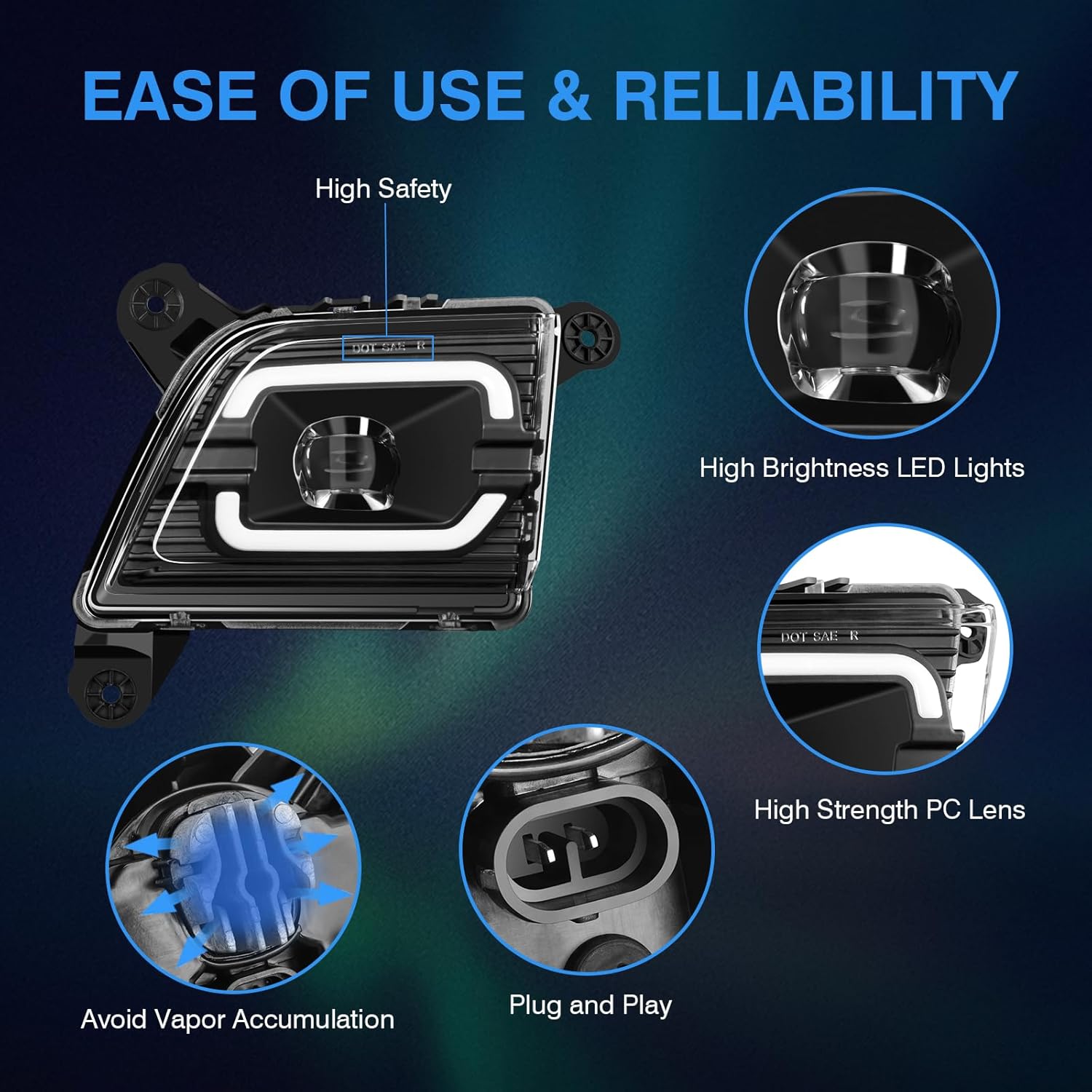 - Easy Installation: Designed for straightforward installation with all necessary hardware and instructions included. The package contains driver and passenger fog lights and a daytime running lights wiring harness, allowing for a quick and simple setup