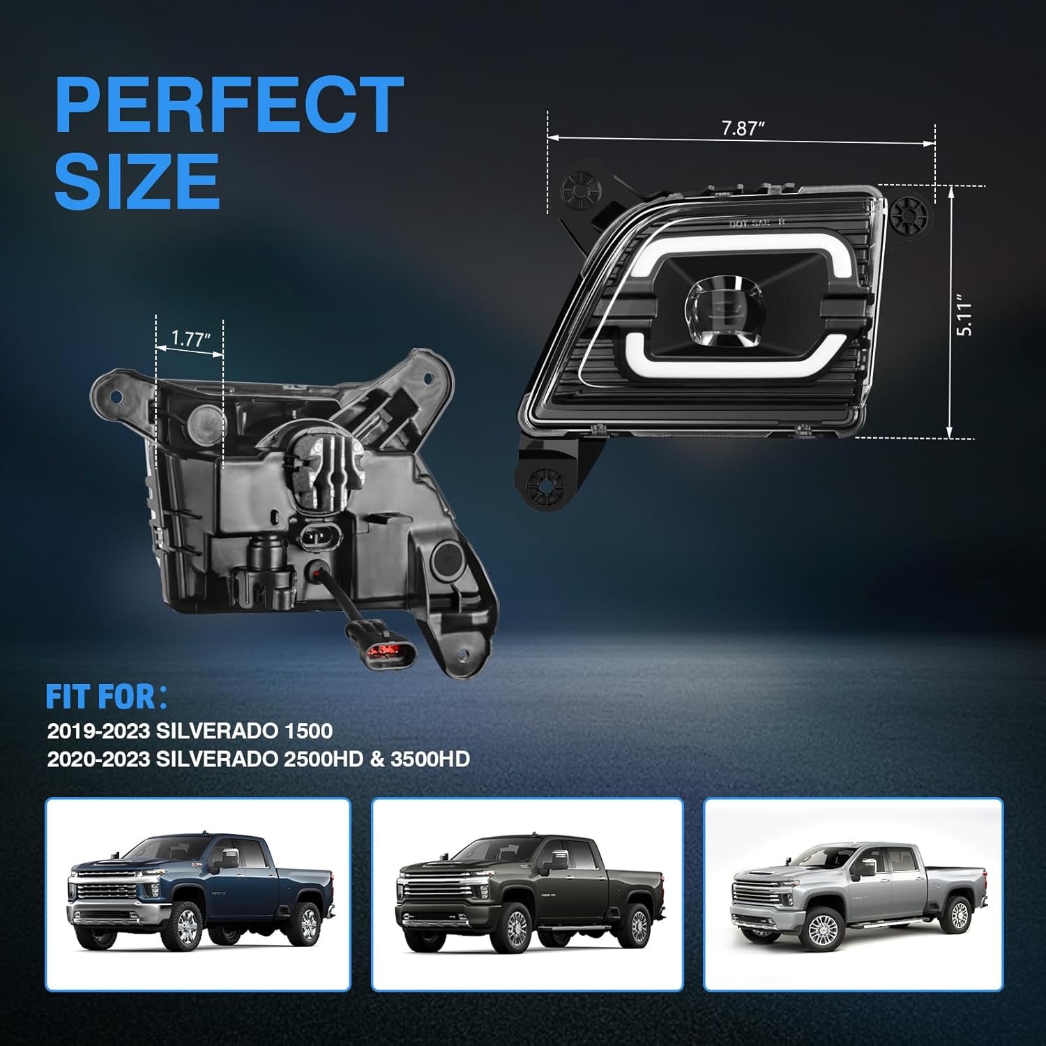 - Perfect Fit: Specifically designed for 2019-2023 Silverado 1500 and 2020-2023 Silverado 2500HD & 3500HD (excluding Silverado 1500LD), our LED fog lights are a precise 1:1 replacement for factory-installed halogen lights. The integrated height adjuster ensures a perfect fit and easy installation