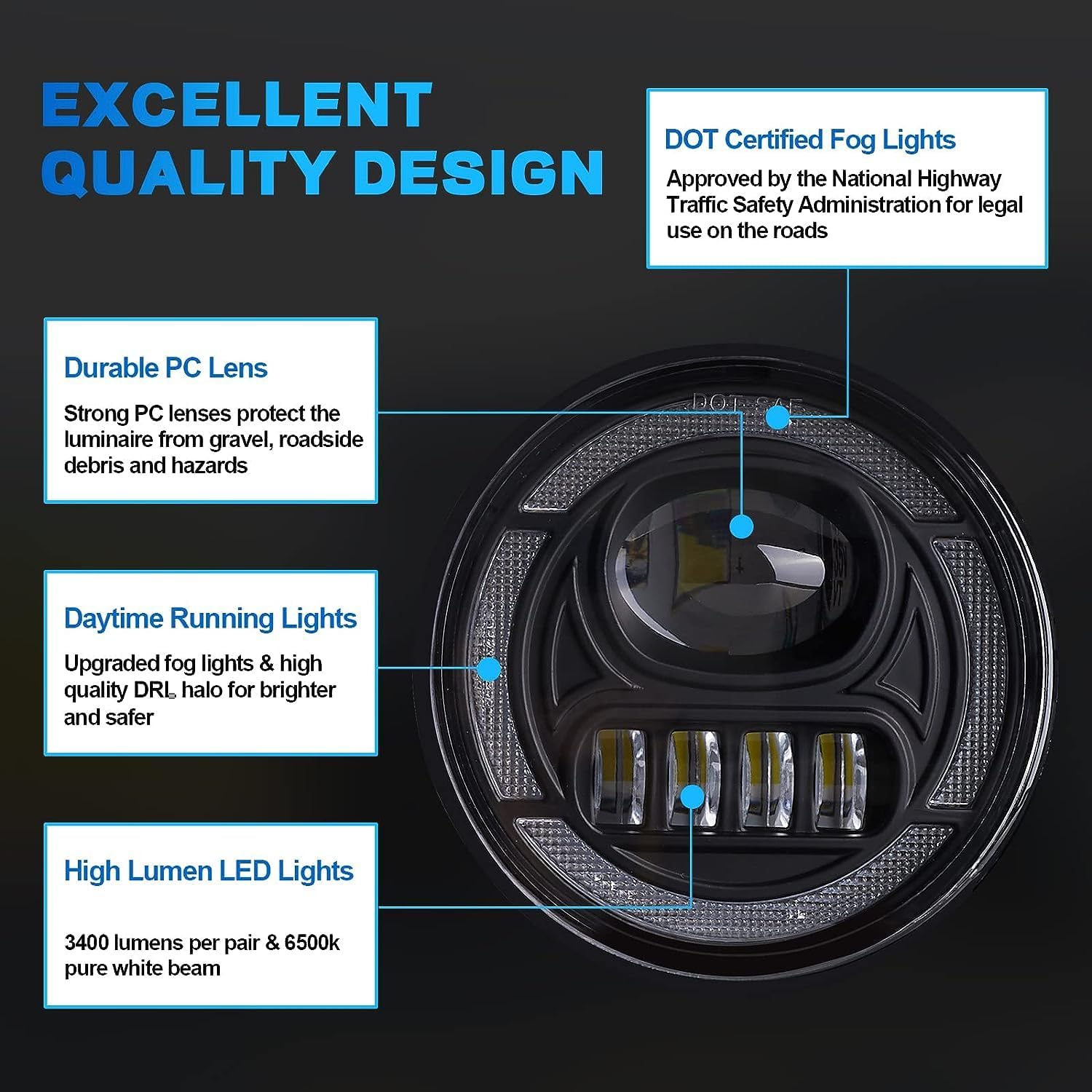 - Superior Durability & Sealability: Our LED fog lights leverage advanced PMMA Welding ABS Technology for superior connections over traditional adhesives, effectively preventing water intrusion and enhancing both durability and waterproofness. Moreover, OKSIWA's fog lights are DOT & SAE certified, meeting all safety standards to guarantee stable and reliable performance